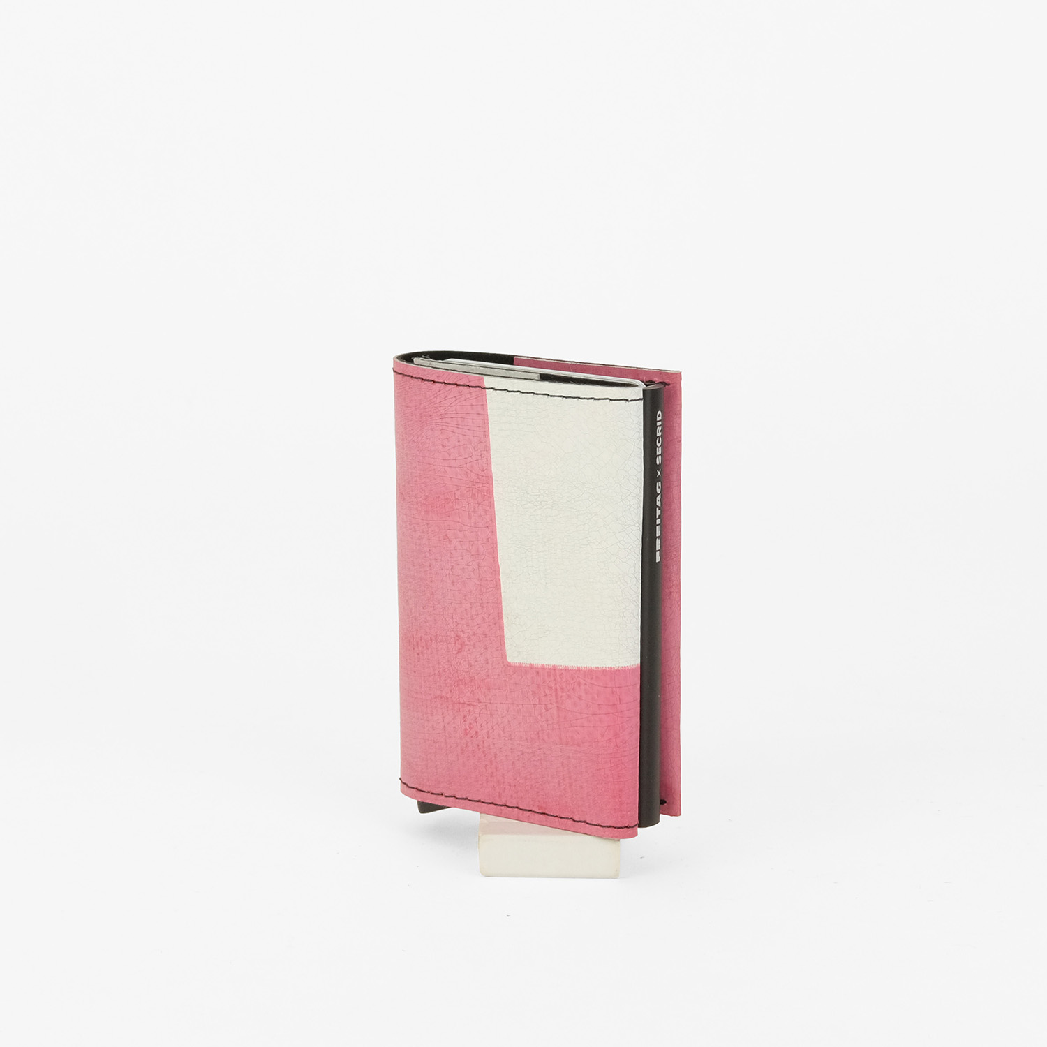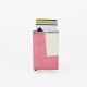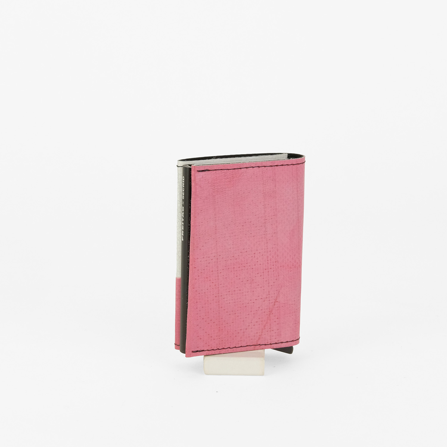 Upgecycelter Aluminium-Cardprotector, den die Qualitätskontrolle zwar für funktional perfekt, aber aufgrund kleiner oberflächlicher Mängel nicht für schön genug befunden und ihm deshalb ein Asphalt-Laser-Design verpasst hat