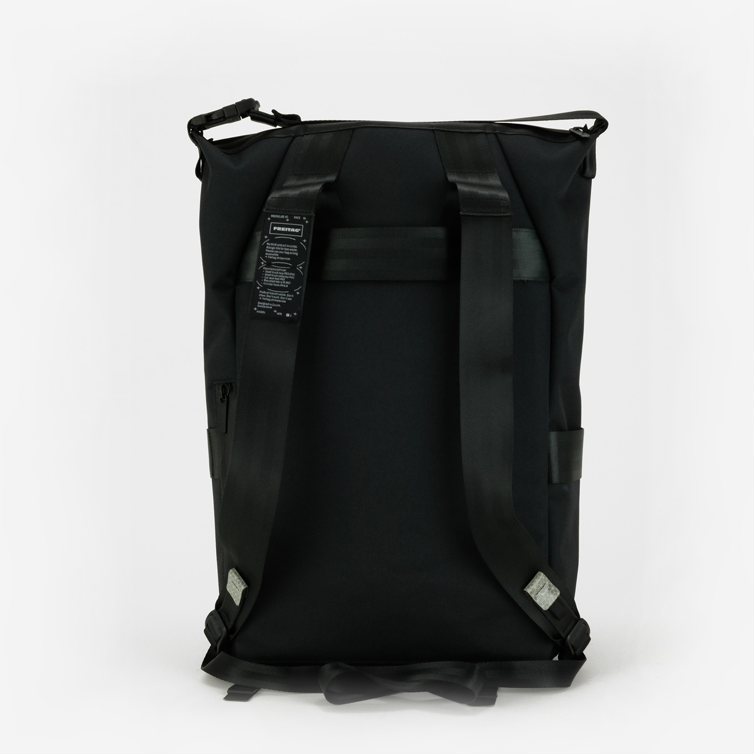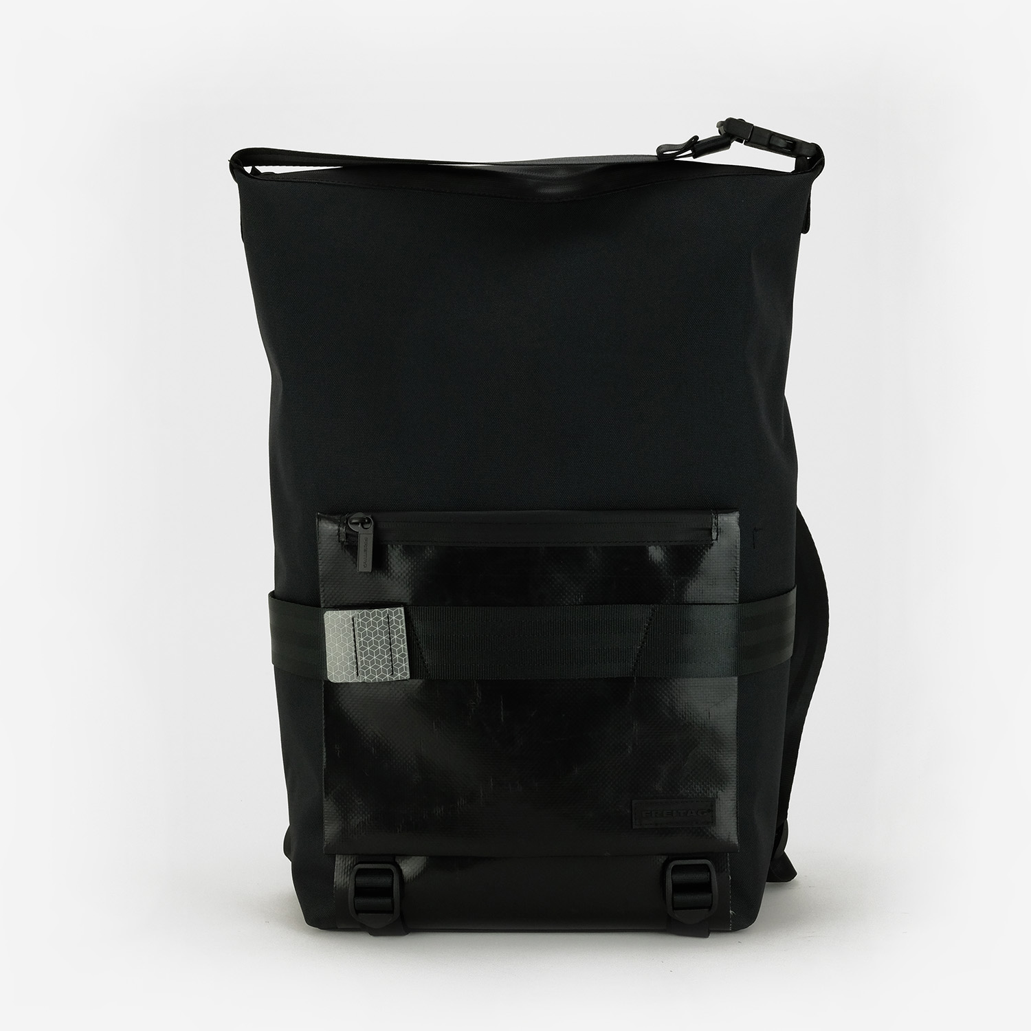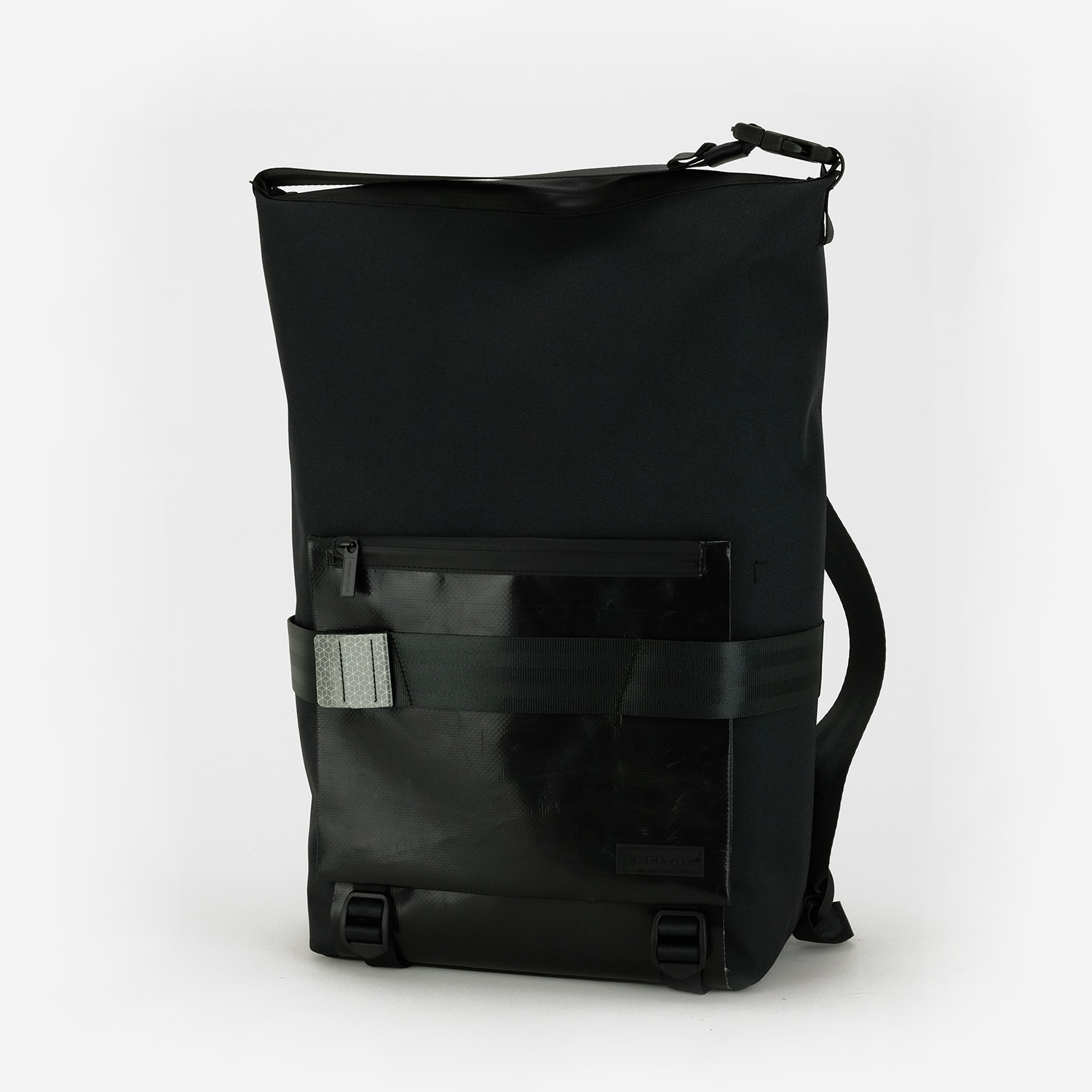 Zippered main compartment in spun-dyed, PFC-free fabric consisting of recycled PET (R-PET) and a water-repellent TPU coating.