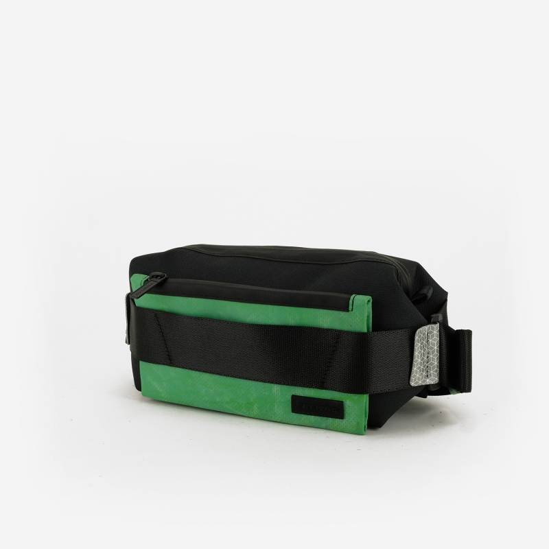 The F650 DIXON shoulder bag, recycled and reflective, has landed in the FREITAG never-out-of-stock range: for the first time, not only used truck tarpaulins and textiles made from empty PET bottles will be displayed on store shelves, but also the reflective bands found on truck tarpaulins.