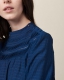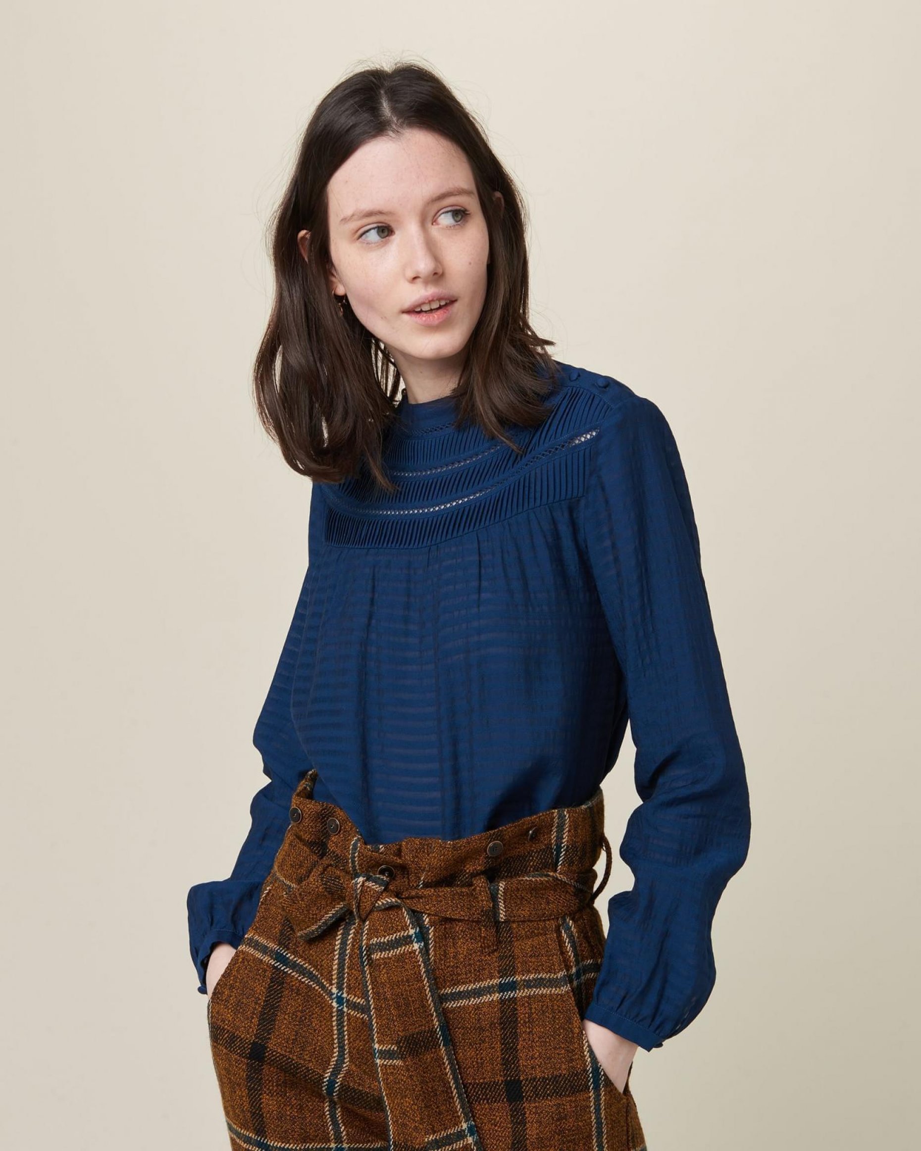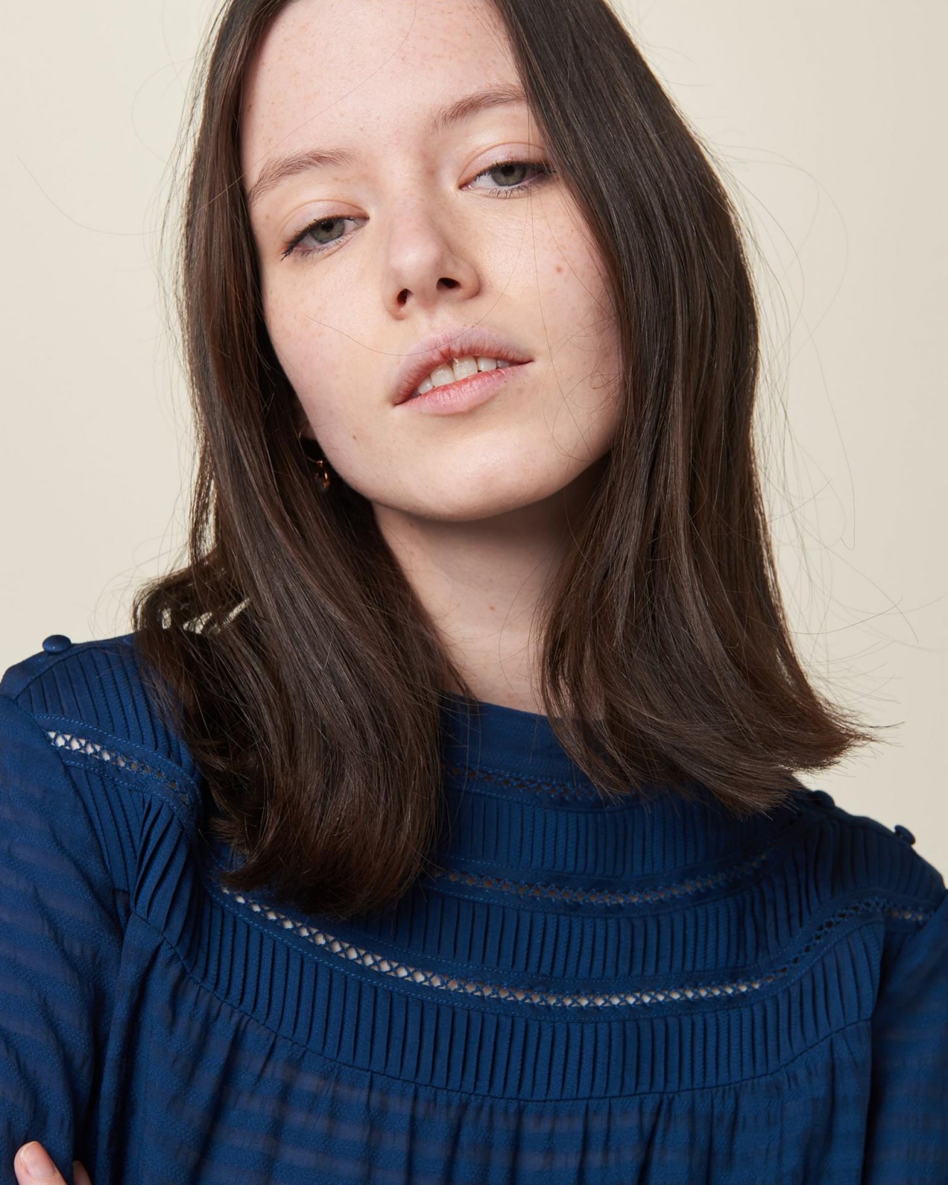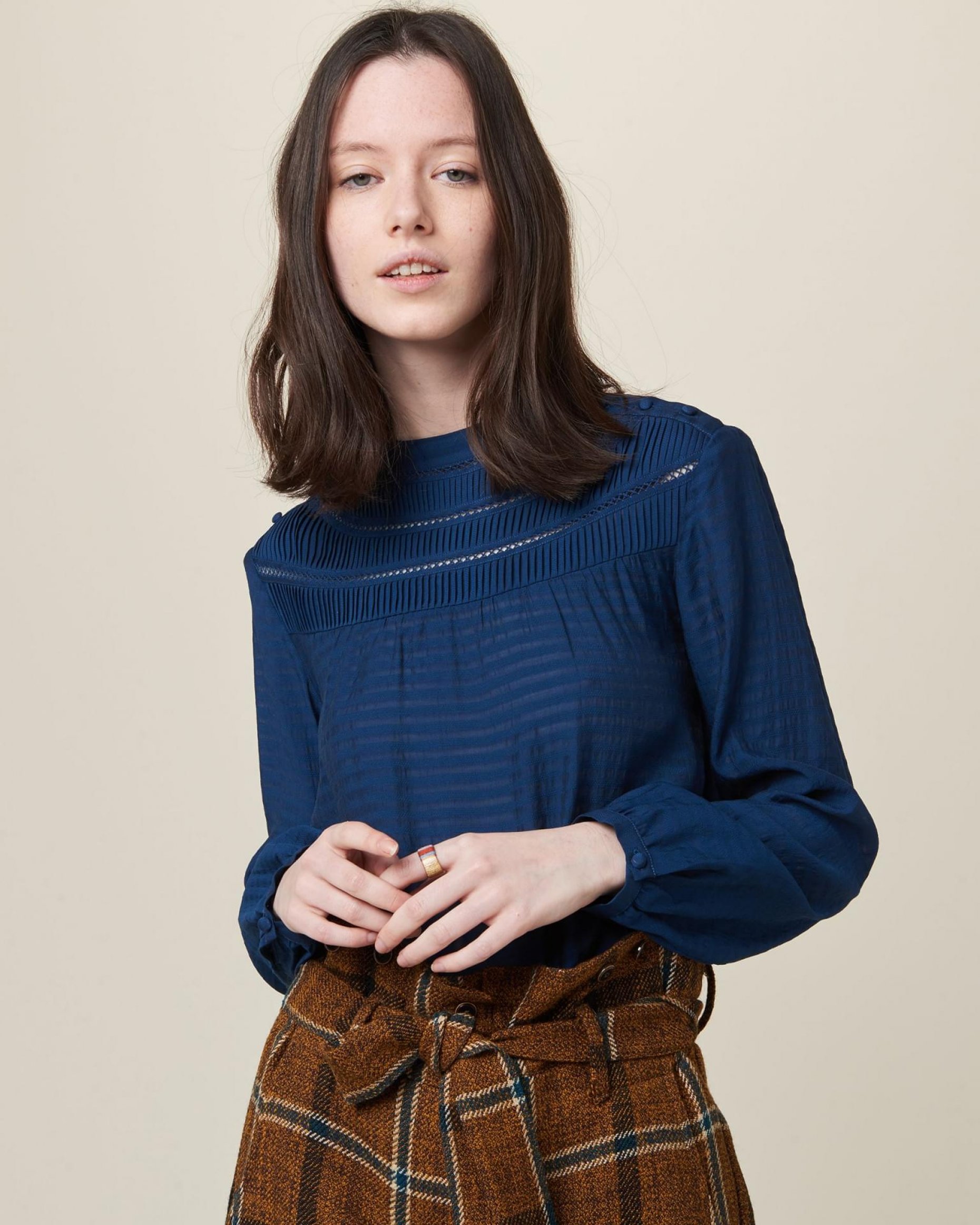 Round neck. Shoulder plackets. Pleated yoke at the front and transparent details. Pleats at the front and back. Fitted cuffs with jewel buttons.