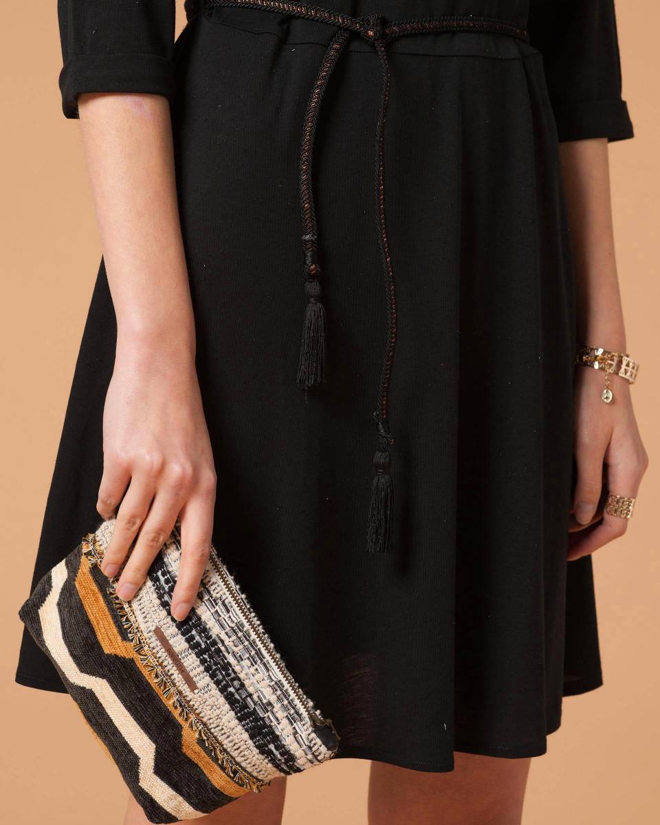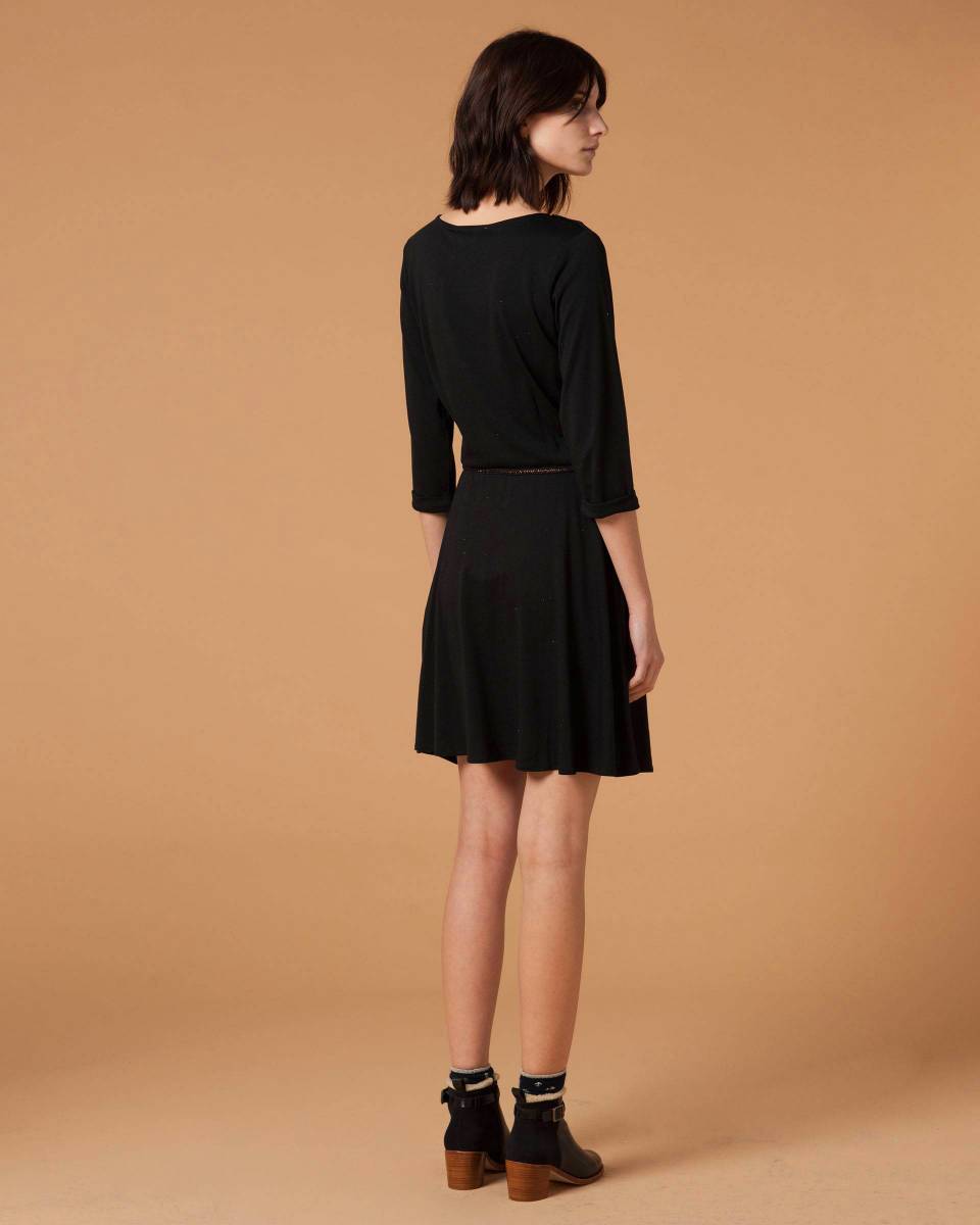 Selina skater skirt in single jersey. Boat neck. Three-quarter length sleeves. Button detail on shoulder. Elasticated waist. Removable woven tassle belt. Flared skirt. Length: mid-thigh.