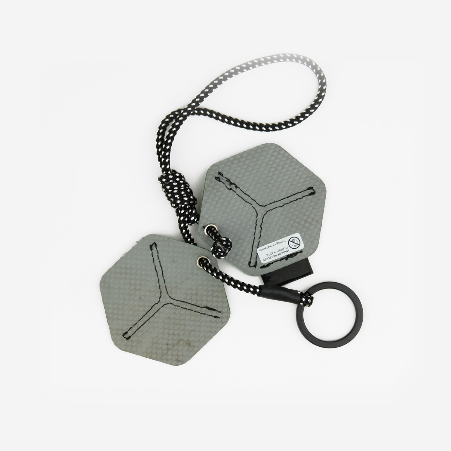 Ispirandosi ai celebri dadi di peluche da appendere allo specchietto retrovisore, FREITAG ha realizzato affascinanti pezzi unici bidimensionali con teloni di camion usati, che portano ugualmente fortuna. Promesso.