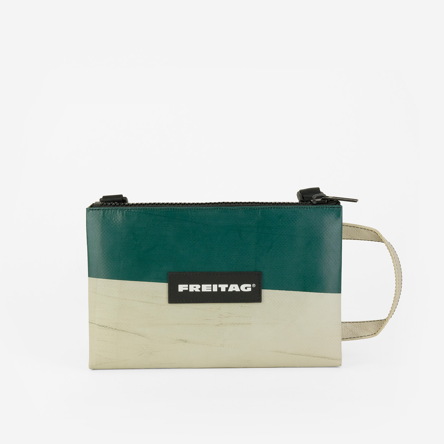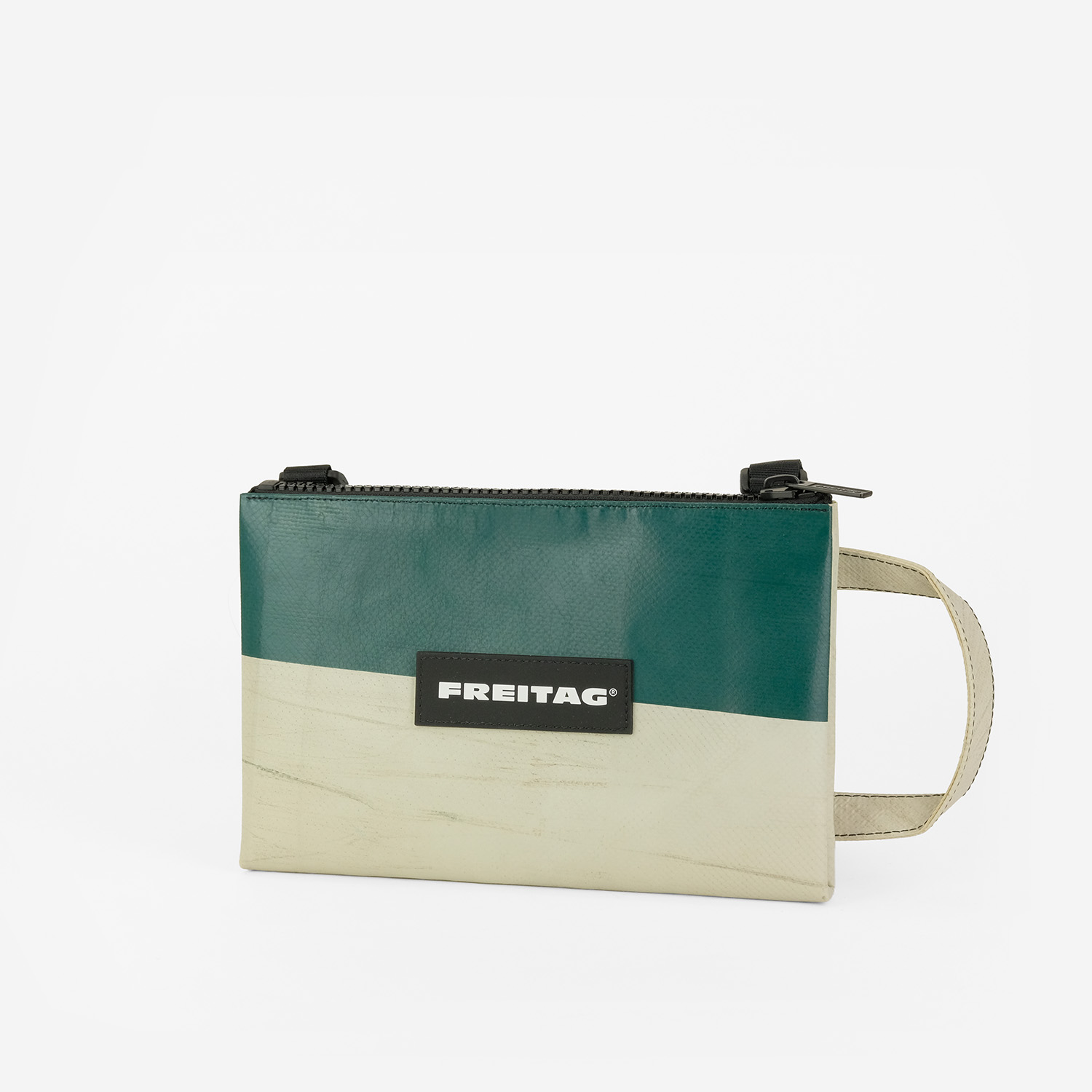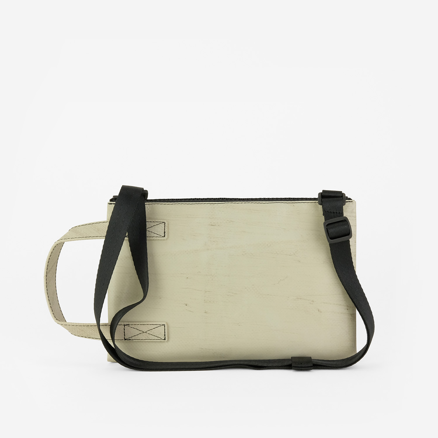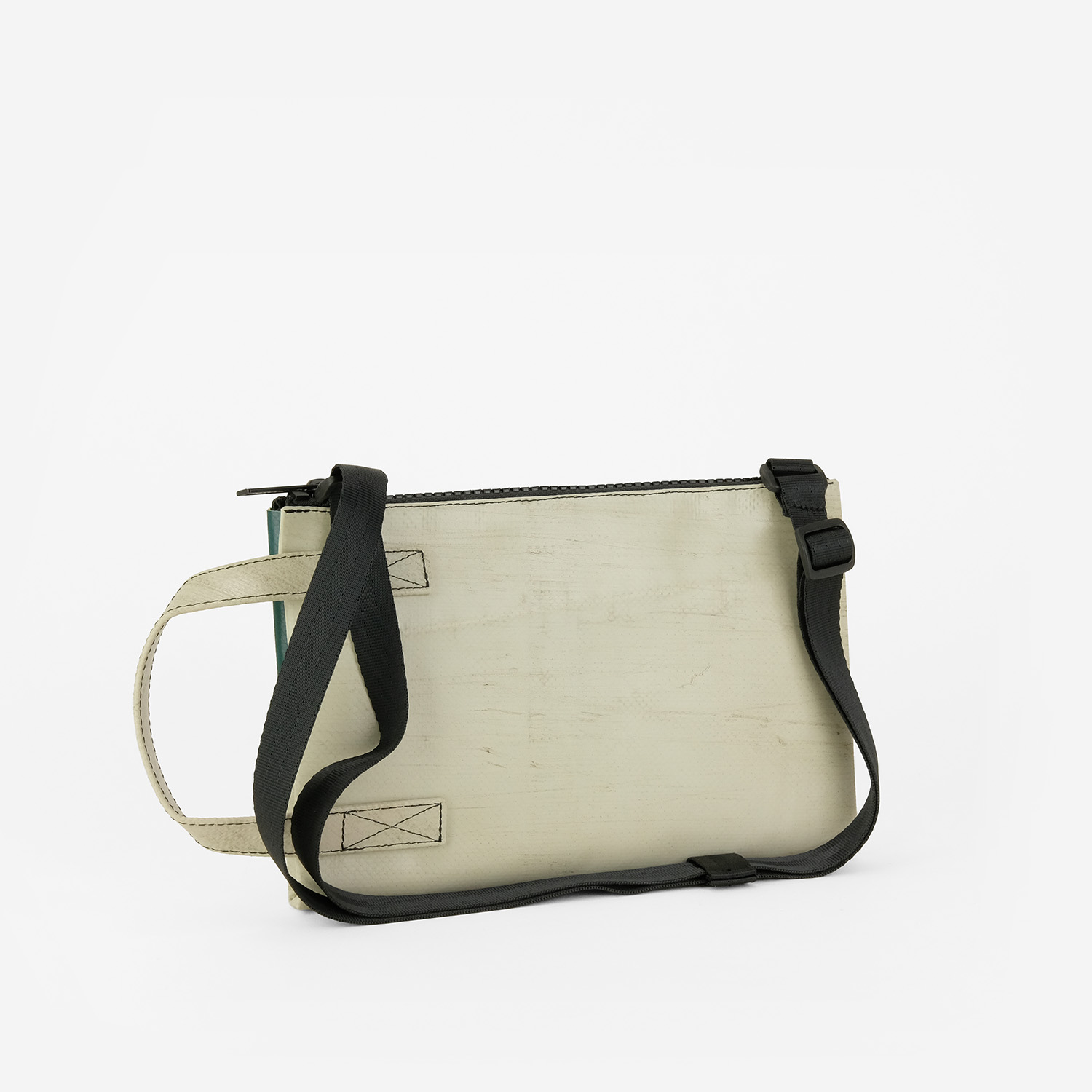 La borsa crossbody piccola e piatta realizzata con teloni di camion usati. Con manico antiscivolo, scomparto segreto e spazio per le cose importanti.